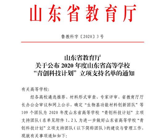 2019年,山东省首次实施“山东省高等学校青年创新团队发展计划”。bat365官网连续2年申报并获批青年创新团队。此次“青创科技计划”的立项建设是bat365官网大力实施重点学科建设和人才队伍建设取得的又一项重要成果,为进一步激发bat365官网高水平、高质量科研成果的产出、服务经济社会发展搭建了更高的平台,也为建设“一流学科、一流专业”提供了科研支撑。