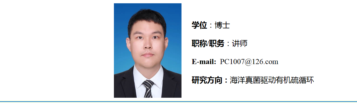 中共党员,2023年12月毕业于南京大学生物学专业,获理学博士学位。2024年6月进入bat365在线中国官网登录入口工作。主要从事海洋真菌驱动有机硫循环的相关研究。近年来以第一作者身份在《Science of The Total Environment》、《iScience》、《BMC genomics》、《Frontiers in Microbiology》等学术期刊上发表论文多篇。
