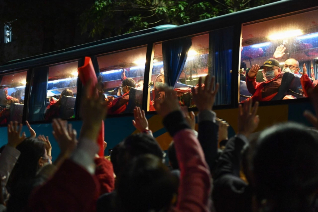 2月10日,广东首批支援湖北荆州应对新冠肺炎医疗队的81名南方医科大学南方医院医护人员与为他们送行的亲人和同事挥别。新华社记者 刘大伟 摄